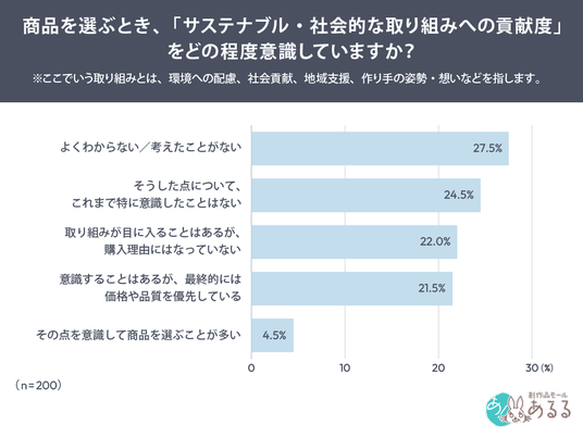 「商品を選ぶ際に、サステナブル・社会的な取り組みへの貢献度をどの程度意識しているか」という質問に対し、約7割が積極的には意識していないことが分かりました。