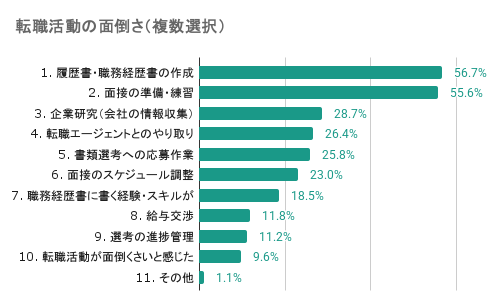 転職活動のどの部分が面倒だと感じるかについて、もっとも多かったのは「履歴書・職務経歴書の作成」で56.7%、次いで「面接の準備・練習」が55.6%となりました。3位は「企業研究(会社の情報収集)」で28.7%、4位は「転職エージェントとのやり取り」で26.4%、5位は「書類選考への応募作業」で25.8%と続きます。