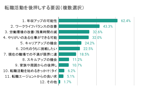 20代が転職活動を後押しする要因は、経済的なメリットと働き方の改善への期待が主な要因であることが分かります。「年収アップの可能性」は6割以上を占めており、経済的な動機が転職活動を後押しする重要な要因となっています。