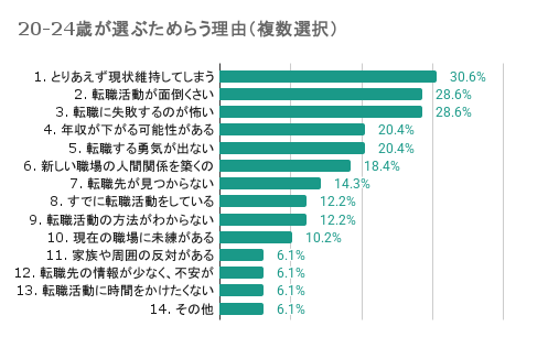 これらの結果から、20代が転職をためらう理由は、現状維持への心理的傾向、転職活動そのものへの負担感、そして転職後の不確実性への不安が主な要因であることが分かります。とくに、「とりあえず現状維持してしまう」が最も多いことから、現状への不満があっても、変化を避けたい心理が働いているようです。