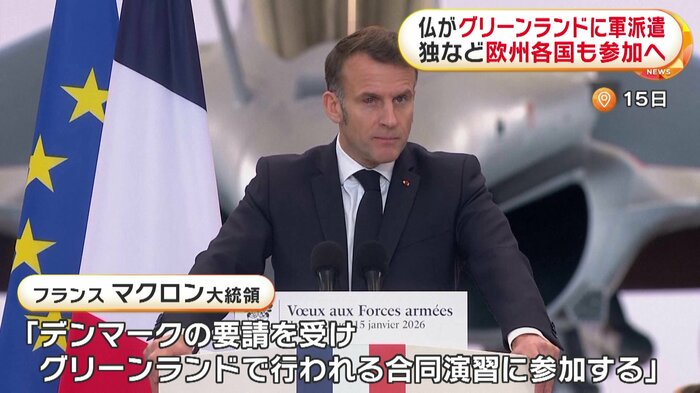 マクロン大統領は15日、SNSで「デンマークの要請を受け、フランスはグリーンランドで行われる合同演習に参加する」と表明した。
