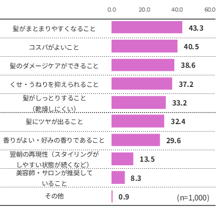 そんな朝の髪の仕上がりに悩む女性がインバスケア商品を選ぶ際に重視する点として最も多いのは「髪がまとまりやすくなること」(43.3%)という結果に。次いで「コスパがよいこと」(40.5%)、「髪のダメージケアができること」(38.6%)となりました【グラフ7】。