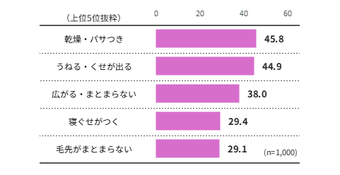 20~30代の、全国の女性を対象にした本調査(n=1,000)で朝に感じやすい髪の悩みについて尋ねたところ、第一位が「乾燥・パサつき」(45.8%)、第二位は「うねる・くせが出る」(44.9%)、第三位「広がる・まとまらない」(38.0%)という結果となり、多くの女性が朝、髪の乾燥・パサつきに悩んでいる実態が明らかになりました【グラフ1】。【グラフ1】朝に感じやすい髪の悩み(複数回答)