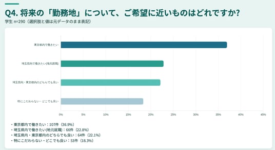 調査の結果、東京都内での勤務を希望する学生が一定数いる一方で、「実家から通いたい」「慣れ親しんだ地元で働きたい」という理由から、埼玉県内での勤務を理想とする声も根強く、居住地と勤務地の相関関係が浮き彫りになりました。