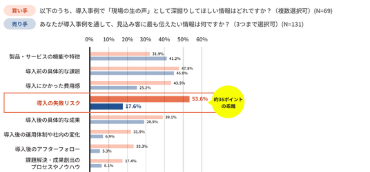 事例の中で「現場の生の声として深掘りしてほしい情報」を聞いたところ、買い手は「導入の失敗リスク(53.6%)」を最も求めました。対して、売り手が伝えたい情報として「失敗リスク」を選択した企業はわずか17.6%に過ぎません。買い手は「失敗しないための防衛策」を求めているのに対し、売り手は「成功した輝かしい結果」のアピールに終始していることが分かります。