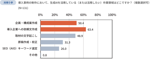 生成AIが作成したことが感じられるテキストについて、買い手の52.9%が「抵抗感がある」と回答しました。一方で、制作現場では「導入企業への依頼文作成(63.4%)」や「構成案作成(50.4%)」などでAI活用が進んでいます。売り手はAI活用によって生産性を高めつつ、最終的なアウトプットにおいて買い手の抵抗感を払拭する工夫が求められていると言えるでしょう。