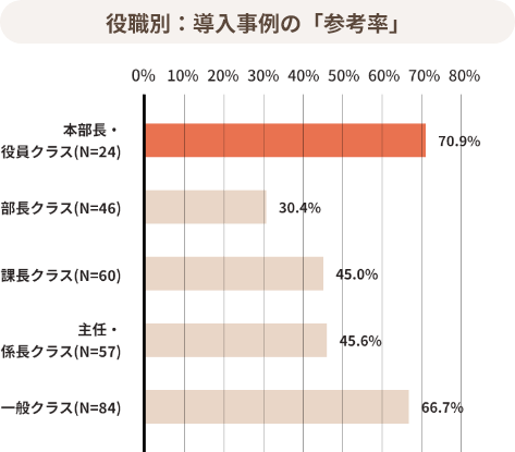 - 役職別の閲覧率では、「本部長・役員クラス」が70.9%と最も高く、経営層ほど導入事例を意思決定の参考にしている実態が判明。