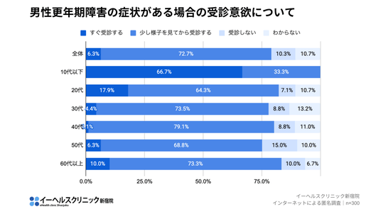 男性更年期障害の症状がある場合、医療機関を「すぐ受診する」と回答した人は6.3%にとどまり、「少し様子を見てから受診する」と回答した人は72.7%と最も多い結果となりました。年代別に見ると、10代・20代・60代以上では、全体と比較してすぐ受診する人が多い一方、働く世代である30~50代は、少し様子を見る人や受診しない人が多く、受診意欲が相対的に低い傾向が見られました。
