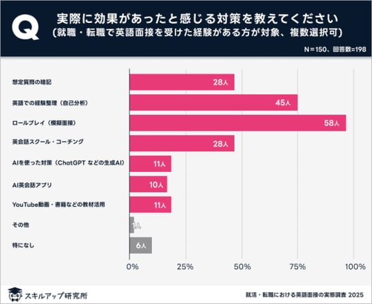 実際に効果があったと感じる対策として最も多く挙げられたのは、「ロールプレイ(模擬面接)」で58件あった。