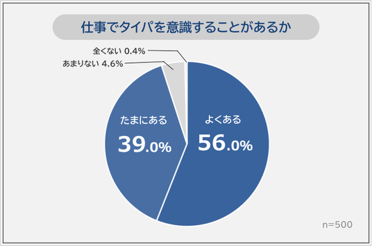 社会人の男女500人に「仕事でタイパを意識することがあるか」を聞いたところ、「よくある(56.0%)」「たまにある(39.0%)」が合わせて95.0%でした。