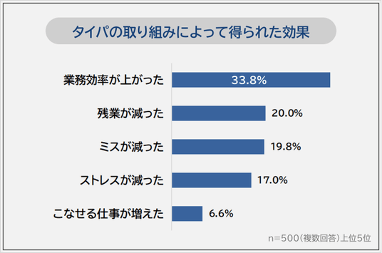 「タイパの取り組みによって得られた効果」として最も多かった回答は、「業務効率が上がった(33.8%)」でした。2位「残業が減った(20.0%)」、3位「ミスが減った(19.8%)」が20%前後で続きます。