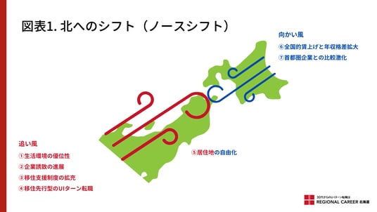 北海道へのUIターン転職の人気は高まっており、特に40代・50代以上の層や前職年収700万円以上の層でUIターンが増えています。その背景には、Rapidusをはじめとした企業誘致の進展、気候変動によるコメやブドウの最適地化、年平均気温で言うところの暮らしやすさの再評価など、北海道を取り巻く環境の変化があります。このマクロな変化を、本白書では「北へのシフト(ノースシフト)」という新たな言葉で定義しています。
