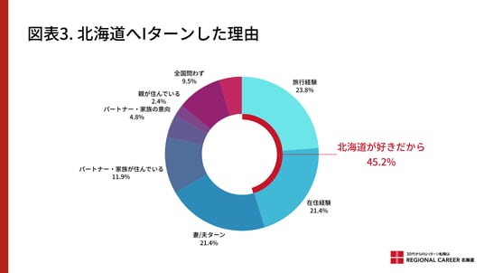 一方で、Iターン理由で多いのは「北海道が好きだから」という理由で45.2%にも上り、家族関連の理由(40.5%)よりも多くなっています。