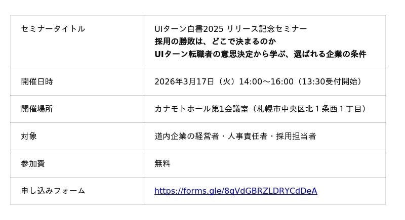 「UIターン白書2025」のリリースを記念し、道内企業の経営者・人事責任者・採用担当者、ならびにメディア関係者を対象としたイベントを開催します。