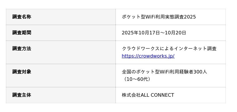 通信インフラ事業と地域振興事業を手掛ける株式会社ALL CONNECT(代表取締役社長:岩井宏太・本社:福井県福井市)が運営する通信メディア「オールコネクトマガジン( https://all-connect.co.jp/magazine/ )」は、全国のポケット型WiFi利用経験者300名を対象に「ポケット型WiFiの利用実態調査」を実施しました。