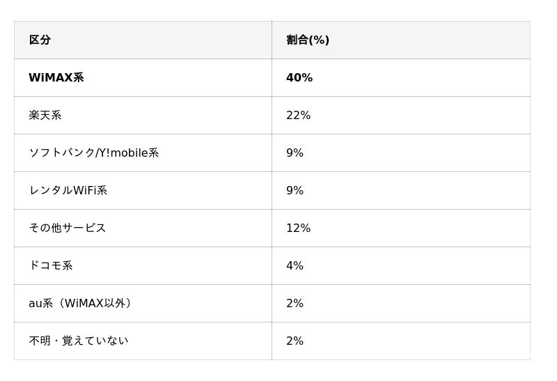 WiMAX系が全体の約4割を占め、他のサービスより利用者が多いこと が分かります。