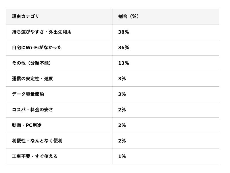 WiMAXを含むポケット型WiFiを契約した理由としては、以下の傾向が多く見られました。