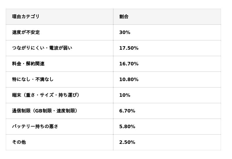 選ばれる理由では通信の安定性が評価されていましたが、利用シーンや場所によっては不安定さを感じるユーザーも一定数存在しました。