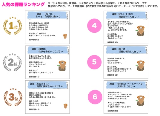 伝え方のメソッドを学ぶ座学に加え、講演中に実際の業務シーンを想定したワークに取り組む構成が特徴です。