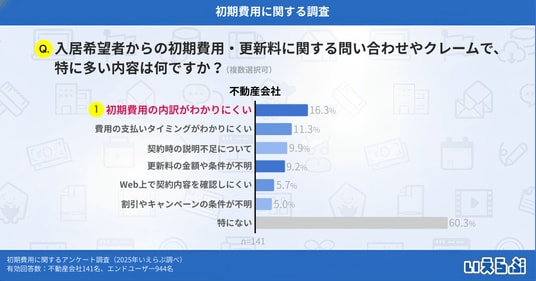 不動産会社に「入居希望者からの初期費用・更新料に関する問い合わせやクレームで、特に多い内容は何ですか?」と質問したところ、「特にない」という回答が圧倒的に多く、60.3%という結果となりました。一方で、クレーム内容としては「初期費用の内訳がわかりにくい」(16.3%)、「費用の支払いタイミングがわかりにくい」(11.3%)となりました。
