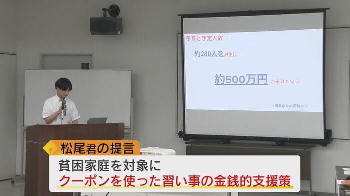 松尾くんは「全国で22%の子どもたちが、習い事をできていない状況にあります。一番、大きいのが経済的負担です。まず1つ目は、貧困家庭の習い事へ、金銭的支援を考えています」と提言。子ども1人当たり、月1万円の支援を行っている福岡市を例に挙げ、貧困家庭を対象に、クーポンを使った習い事の金銭的支援を訴えた。
