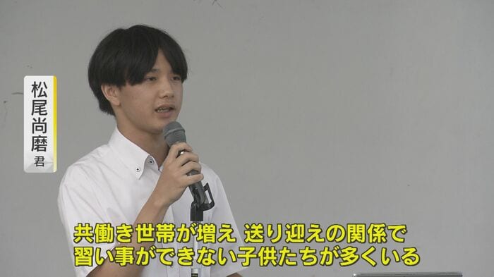さらに2つ目として松尾くんは「小学生の時、習い事で剣道とサッカーをしたいと思っていたんですけど、親が仕事の関係で送り迎えができないと。共働き世帯が増えている関係で時間が取れないから、習い事ができないという子どもたちが多くいます」と続けた。幼い頃の苦い経験から、コミュニティーバスなどと連携した送迎の支援策も提言したのだ。