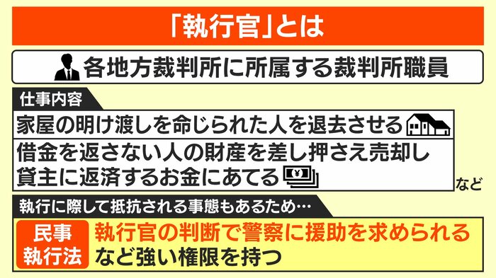 執行に際して抵抗される事態もあるため、「民事執行法」により、執行官の判断で警察に援助を求められるなど強い権限を持ちます。