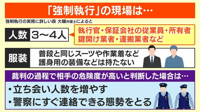 強制執行の実務に詳しい森大輔弁護士によると、「強制執行」は3~4人で行います。(執行官・保証会社の従業員・所有者・鍵開け業者・運搬業者など)