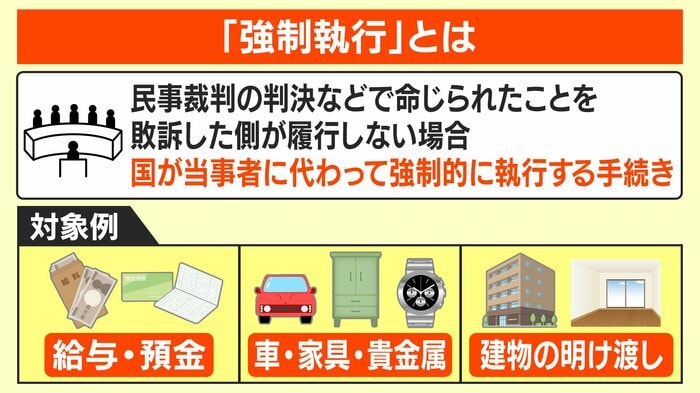 確定した民事裁判の判決などで命じられたことを敗訴した被告が実行しない場合、国が当事者に代わって強制的に実現する手続きのこと。