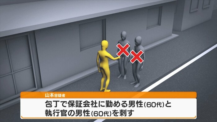 執行官らが一旦外に出ると、山本容疑者が包丁を持って下りてきて、保証会社に勤める60代の男性と執行官の60代の男性を刺したということです。
