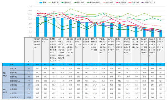 症状に関連して日常生活で困っていることや不満に思っていることについての質問でも、30代男性は「自分が着たいと思う洋服を着にくい」46.8%(全体23.7%)、「服装を選択する際、症状が目立たないように気にかける」64.9%(全体38.8%)といったお洒落する際の困りごとや、「自分の容姿に自信がもてない」51.9%(全体34.2%)、「知人などから足の症状について指摘されたことがある」54.5%(全体19.6%)、「不健康、病気っぽく見られるのではないかと思う」55.8%(全体32.1%)といった見た目に関する不安などでも高い数字を示す。その他、「やりたいアウトドアやスポーツがしにくい」46.8%(全体15.2%)、「外出や歩くのが億劫になる、気が進まない」46.8%(全体17.8%)など行動における不便や、「足がだるかったり不快感もあり、夜すっきり眠れない」54.5%(全体27.5%)、「朝方から頻繁に足がつることもあり、困る」51.9%(全体32.3%)など身体のしんどさでも軒並み数字が高い。