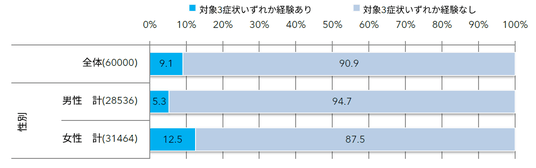 「下肢静脈瘤」が疑われる症状を有する人(以下「症状を有する人」)は、全体の9.1%。男性だけでみると5.3%だった一方、女性では12.5%と有症率は女性の方が高い。