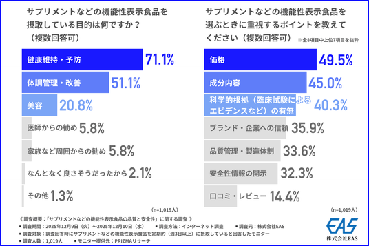サプリメントなどの機能性表示食品をどのような目的で摂取している?選ぶときのポイントは「価格」が最多