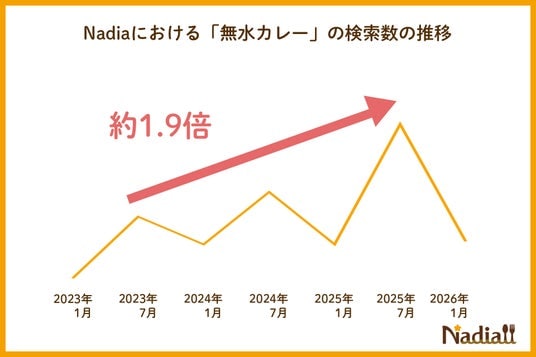 さらに今注目なのが「無水カレー」です。水を入れず、野菜や食材の水分や調味料だけで煮込んで作る無水カレーは年々注目度が高まっており、2023年「無水カレー」の検索が最多の8月と、2025年最多の6月で比較すると、検索数は約1.9倍にまで伸長しました。素材の栄養とうま味をギュっと凝縮できる調理法として、健康意識の高まりと合わせて、夏場を中心に年々関心が高まっています。