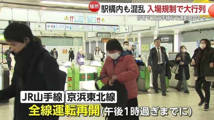 停電により始発から運転を見合わせていたJR山手線と京浜東北線は、午後1時過ぎまでに全線で運転を再開した。