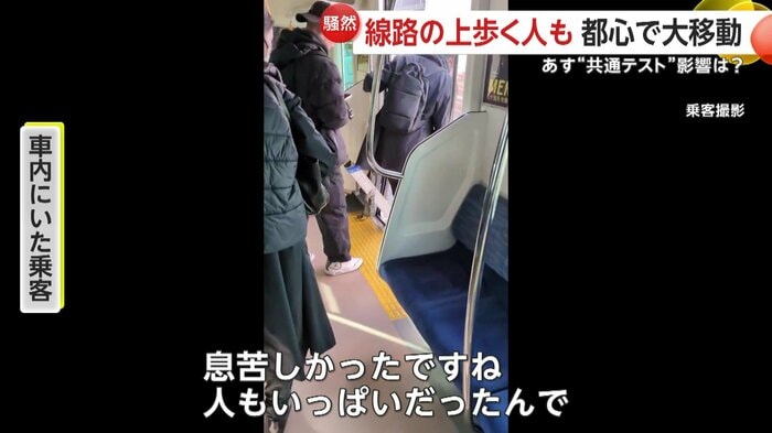 線路上を歩いて浜松町まで移動した男性は、車内での様子を「エアコンも止まっちゃってたんで、すごく暑くなっちゃったんで息苦しかったですね。人もいっぱいだったんで、中には貧血で倒れちゃう人もいて」と話した。