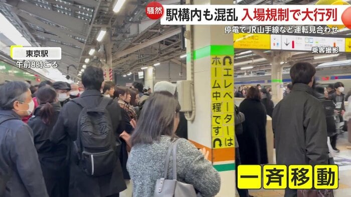 東京駅では、ホームで止まったままの電車から乗客が次々と降り、代わりとなる路線を探して一斉に移動を始める様子が…。