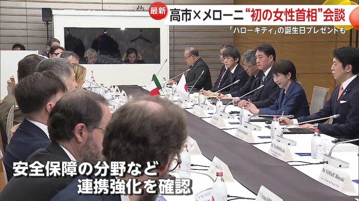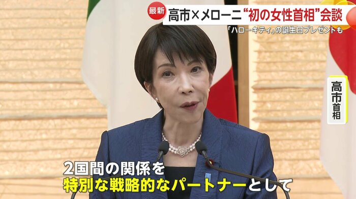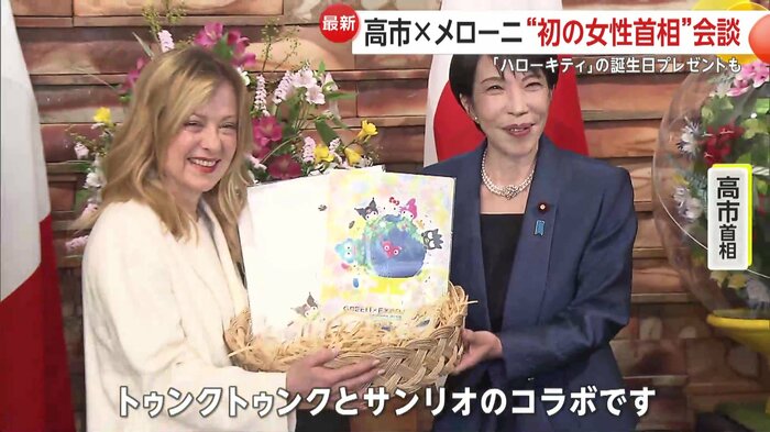 「ジョルジャ」「サナエ」と、ファーストネームで呼び合う関係になり、高市首相はメローニ首相に、イヤリングやサンリオの人気キャラクター・ハローキティのグラスをプレゼントした。