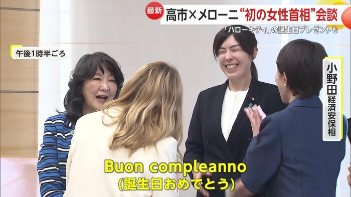 小野田経済安保相は、イタリア語で「Buon compleanno(誕生日おめでとう)」と伝えた。