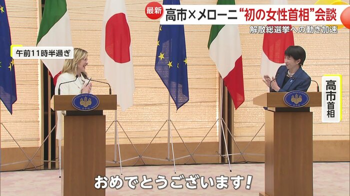 記者発表でも高市首相は、「2国間の関係を特別な戦略的なパートナーとして、さらなる高みを目指すことにした。ジョルジャとの間で日本とイタリア、リーダー2人の距離がさらに縮まることを実感する機会になったと感じる」と述べた。
