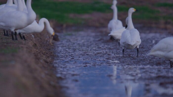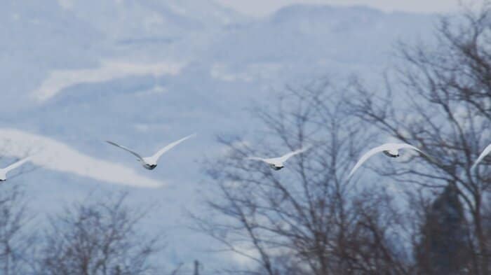 朝が訪れ、気温が上がり始める午前10時頃になると、ハクチョウたちは一斉に飛び立つ。目指すのは約1キロ離れた田んぼだ。彼らが求めているのは、刈り取りが終わった田んぼに残る二番穂である。柔らかな冬の日差しを浴びながら、ハクチョウたちは午後のひとときを過ごす。