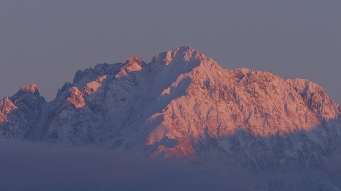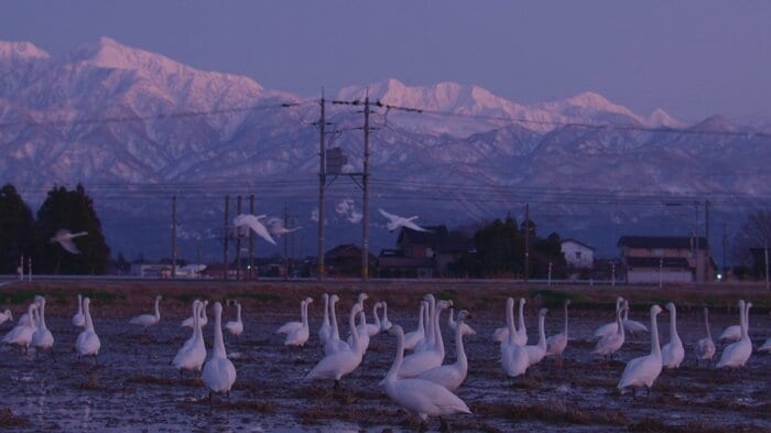 北アルプスが夕日に染まる頃、ハクチョウたちは水の張られた田んぼへと移動し始める。そして再び、ねぐらである常願寺川へと帰っていく。