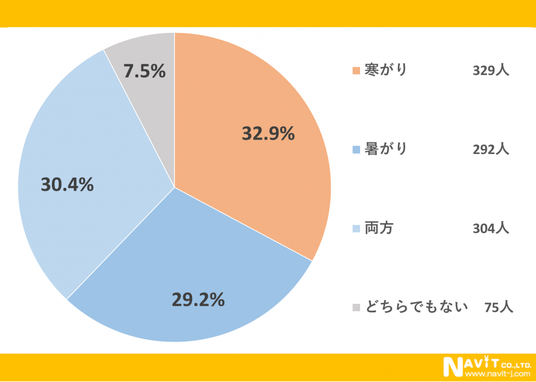 暑がりか寒がりかをたずねたアンケートでは「寒がり」が一番多く32.9%と約1/3の人が寒がりということがわかりました。次に多かったのは「両方」で30.4%、「暑がり」が29.2%という結果になりました。ちなみに筆者は「どちらでもない」です。