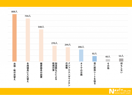 次は冬支度についてのアンケートです。こちらも複数回答にていただいております。一番多かったのは「衣服・靴の衣替え」で808人、次が「冬用寝具に入れ替え」で734人で3番目に「暖房器具の設置」で548人という結果になりました。