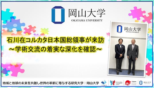 国立大学法人岡山大学(本部:岡山市北区、学長:那須保友)は、2026年1月7日に石川義久在コルカタ日本国総領事が訪れ、那須保友学長を表敬訪問しました。面会では、西ベンガル州との学術交流の現状や、今後の連携の方向性について意見交換が行われました。