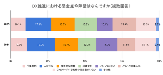 懸念点・障壁では、依然として「DX人材不足」(17.3%)が最多ながら微減。一方、「ノウハウの属人化」が2024年の11.6%から15.9%へと大幅に上昇し、懸念事項の第2位に浮上しました。DX実行が進む中で、ノウハウをいかに組織全体で共有・活用するかが新たな課題となっています。