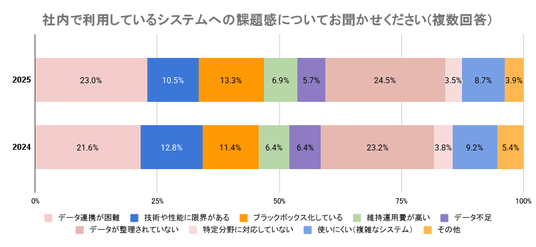 社内システムへの課題感は「データが整理されていない」「データ連携が困難」がツートップ