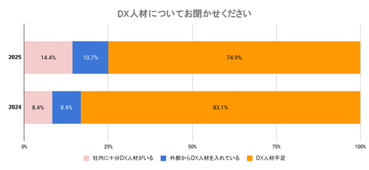 「DX人材不足」を感じる企業は2024年の83.1%から2025年には74.9%へと減少。同時に「社内に十分DX人材がいる」という回答が8.4%から14.4%へと約1.7倍に増加しており、業界全体で人材育成への取り組みが進み、一定の成果が出始めていることが伺えます。