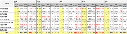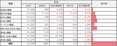 事務的職業は1,395円(前年比86円増、前月比1円減)、専門的職業は 1,518円(前年比104円減、前月比142円減)、飲食の職業は1,212円(前年比40円増、前月比2円減)、販売の職業は1,203円(前年比13円減、前月比2円減)、サービスの職業は1,367円(前年比21円増、前月比24円増)、運搬・清掃・包装等の職業は1,378 円(前年比124円増、前月比73円増)、建設の職業は1,468円(前年比84円減、前月比7円減)、製造・技能の職業は1,550円(前年比337円増、前月比9円減)、教育の職業は1,579円(前年比25円増、前月比28円増)となりました。