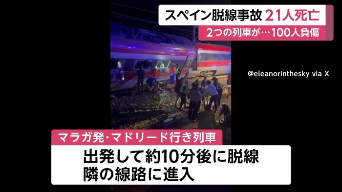 スペイン南部アンダルシア州で18日、2つの高速鉄道が脱線し、少なくとも21人が死亡した。